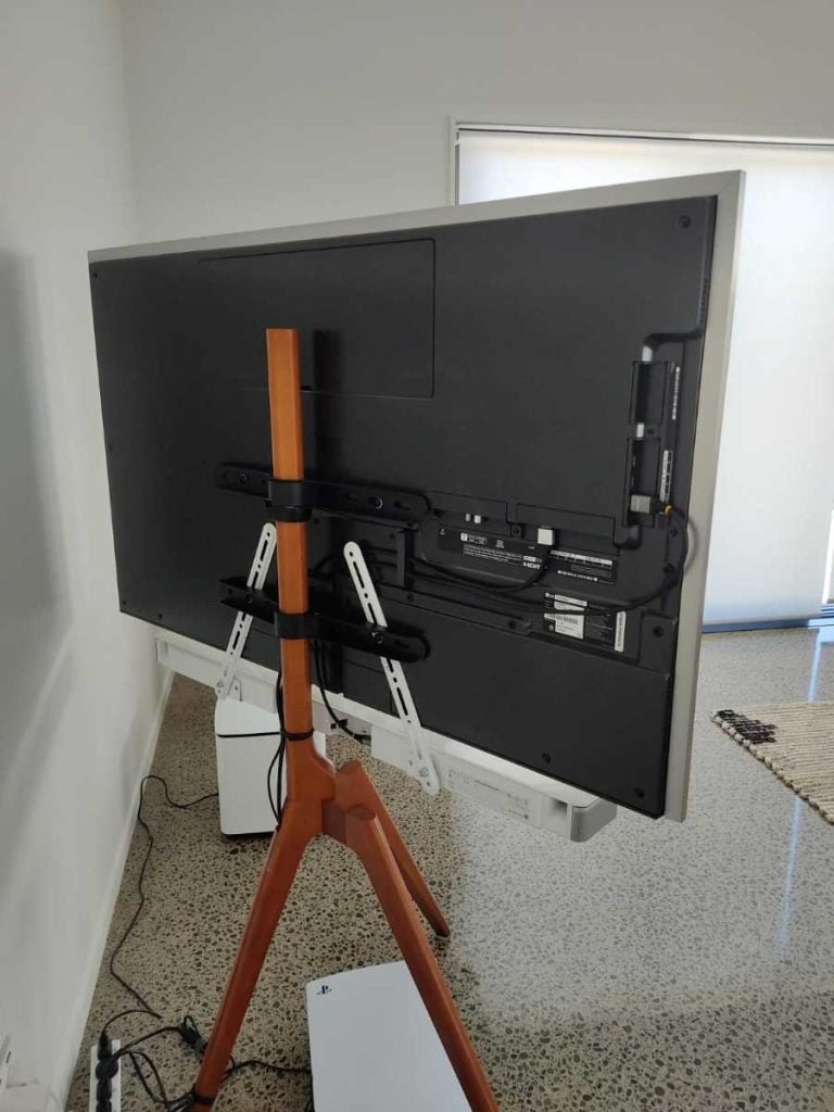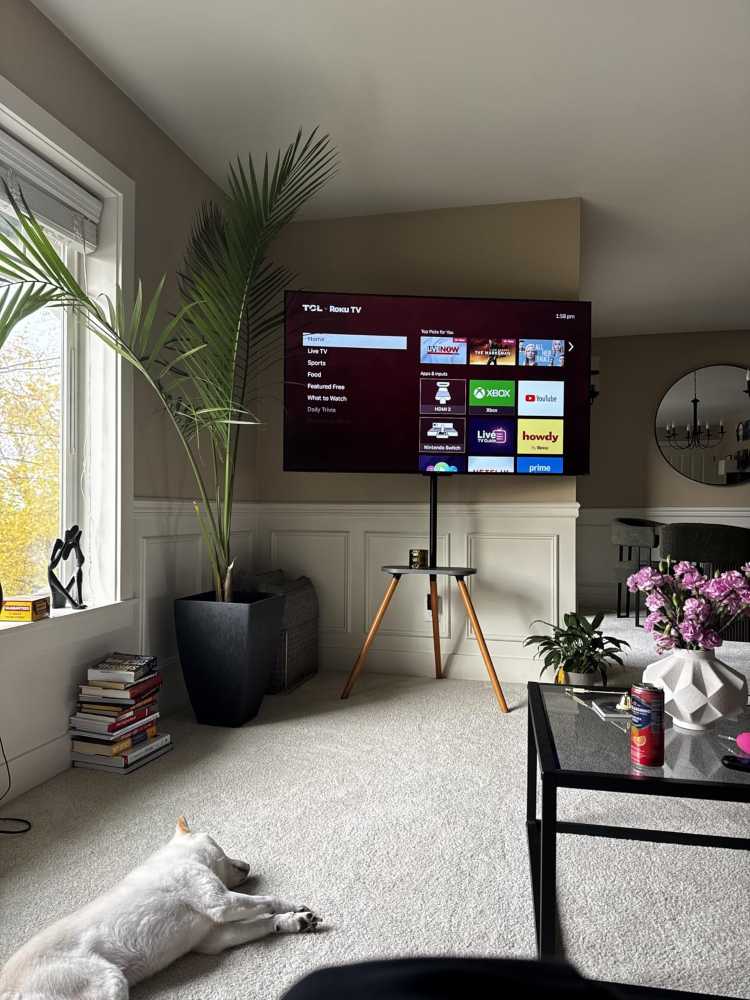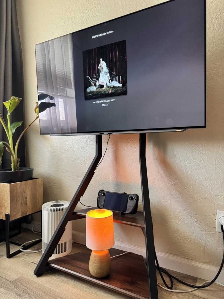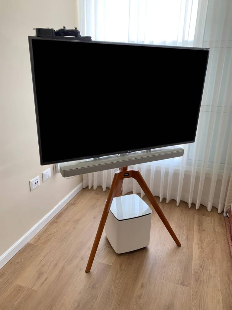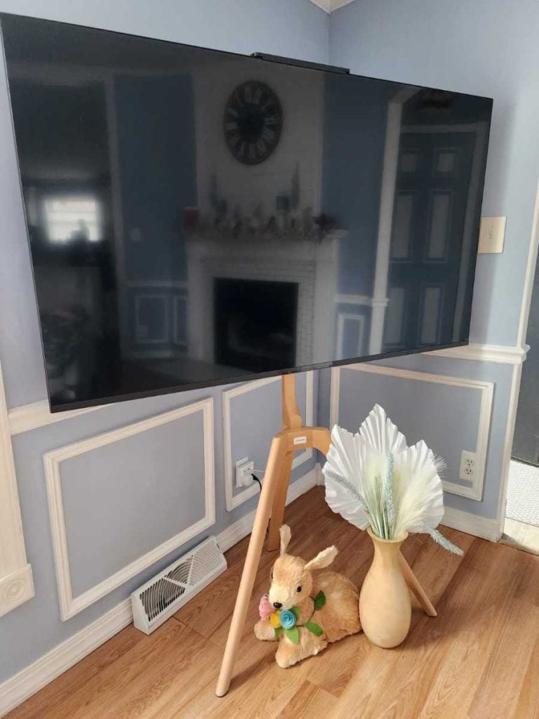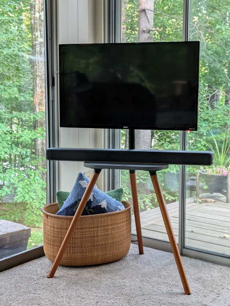 Instead of pushing a bulky entertainment center against the wall, your TV stands tall on three legs — almost like an easel displaying artwork. It feels intentional. Stylish. Designed.